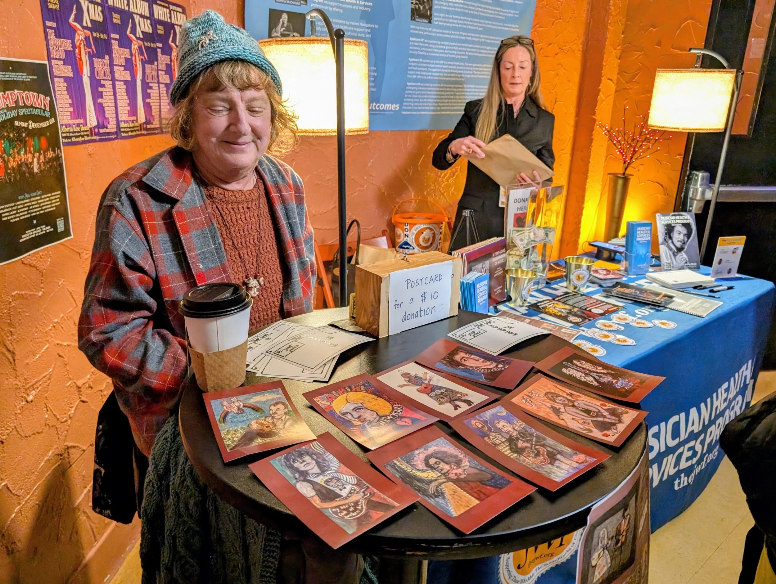 Janet Julian volunteers her time and donates art to the JWF cause - with a little help from Sarah Lonigro at the Alberta Rose Theatre.