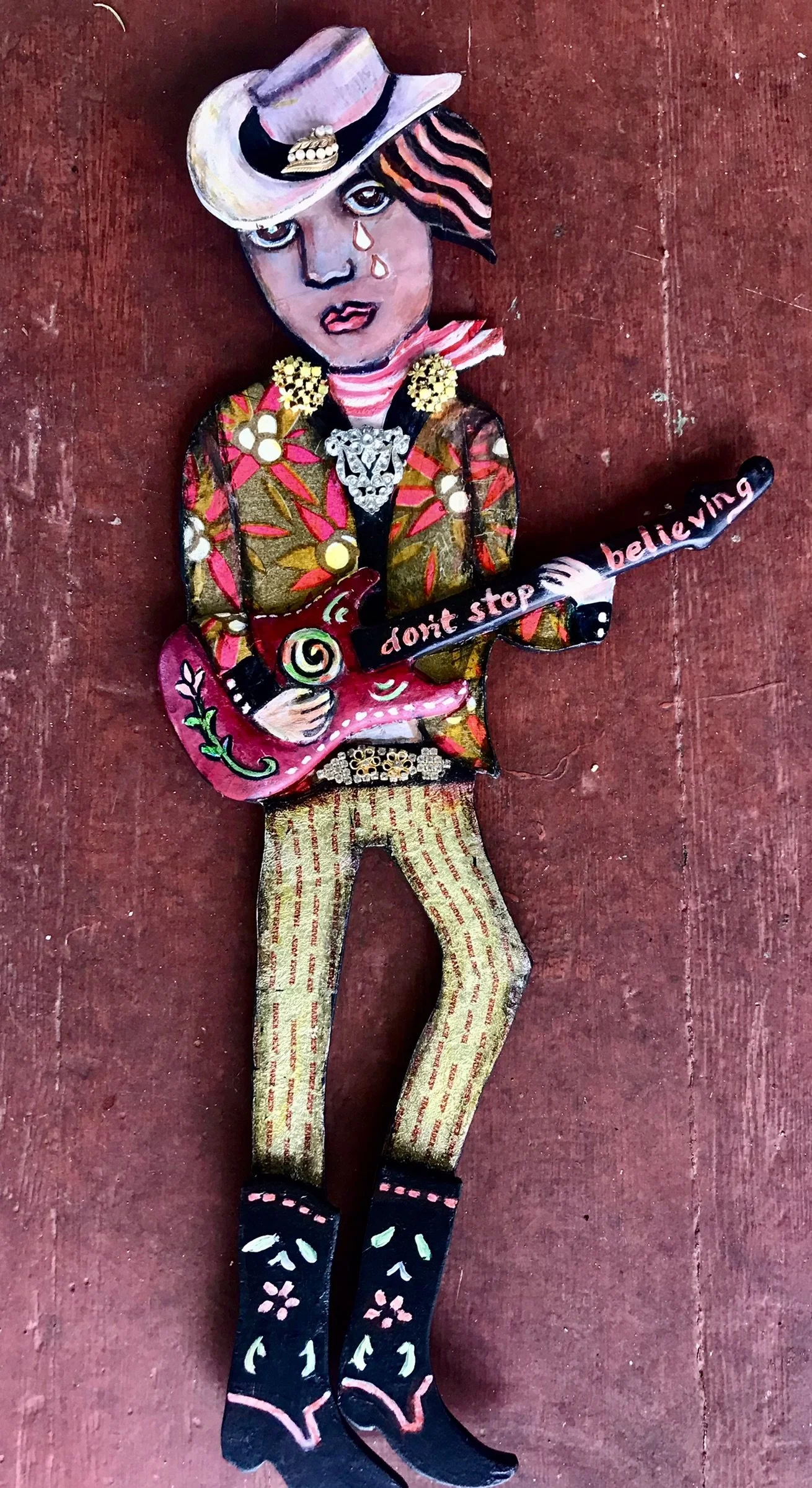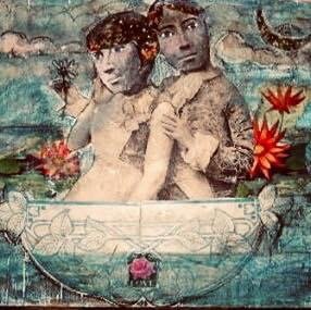 Of her artwork, she says, “Dog-eared and damaged, all the better – I like to take the lost, abandoned and forgotten and give it new life. And I love to hang my arti in the ‘museums of the everyday,’ coffeeshops, bars, dispensaries and beauty parlors.”